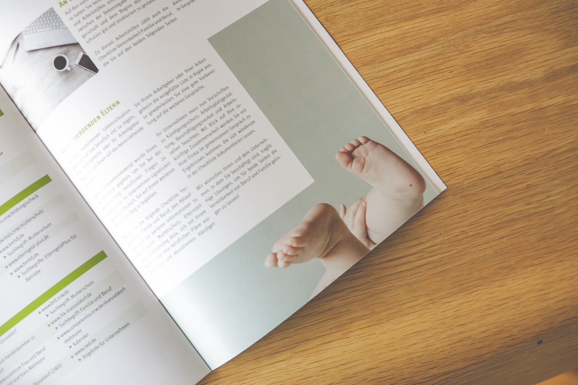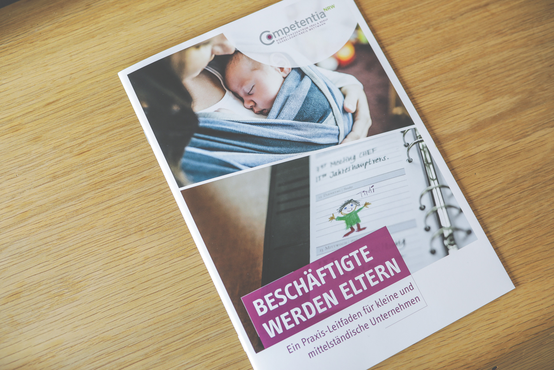 Das Kompetenzzentrum Frau und Beruf Düsseldorf und Kreis Mettmann unterstützt kleine und mittlere Unternehmen bei der Umsetzung einer familienorientierten Personalpolitik. Die Zielgruppe des Kompetenzzentrums sind kleine und mittlere Unternehmen aus allen Branchen. Für den Standort Düsseldorf/Mettmann sollte eine bereits bestehende Broschüre komplett überarbeitet werden. Dafür wurde vollkommen neues Layout angelegt, neue Bilder integriert, Farben und Schriften angepasst und Texte überarbeitet. Nach Freigabe durch das zuständige Ministerium wurde die Broschüre sowohl gedruckt, als auch als Onlinevariante angelegt, die hier heruntergeladen werden kann.